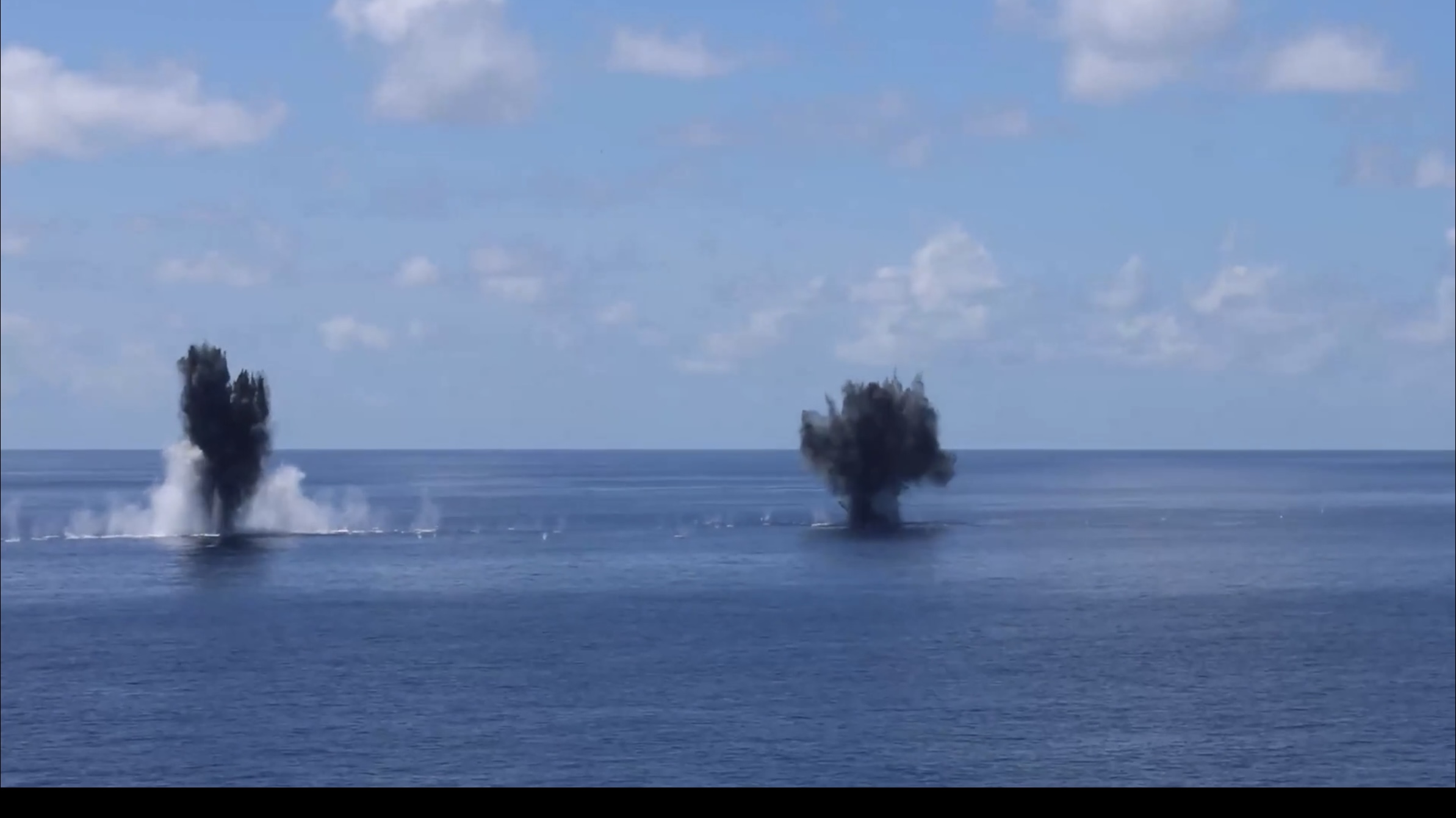 En la grabación difundida en la cuenta oficial del Comando Sur en X se observa la secuencia de disparos coordinados de los caza AV-8B Harrier II y la explosión de municiones de alto calibre sobre las aguas caribeñas