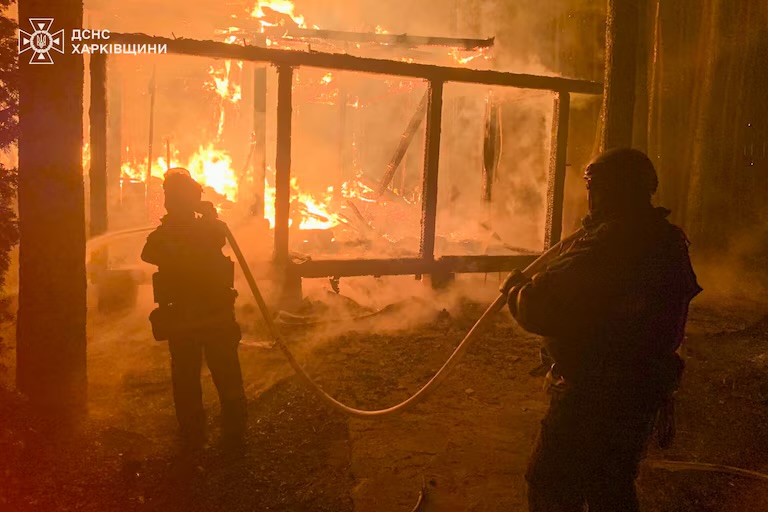 En la ciudad de Chuguiv y en la aldea Shevchenkove, los ataques dañaron instalaciones escolares, provocando llamas y dejando cinco heridos, entre ellos un niño. Rescatistas y médicos, junto a bomberos locales, participaron en la atención de la emergencia y en la extinción de las llamas.